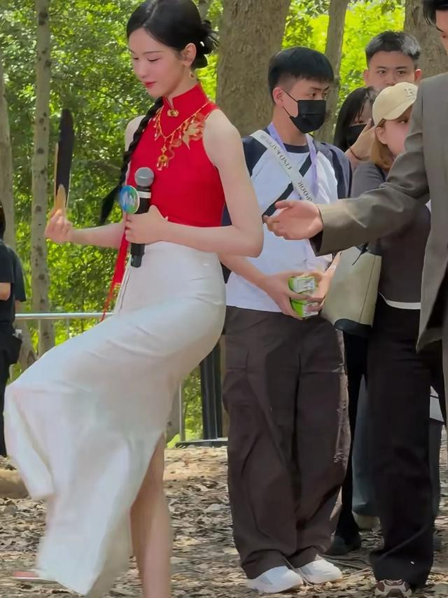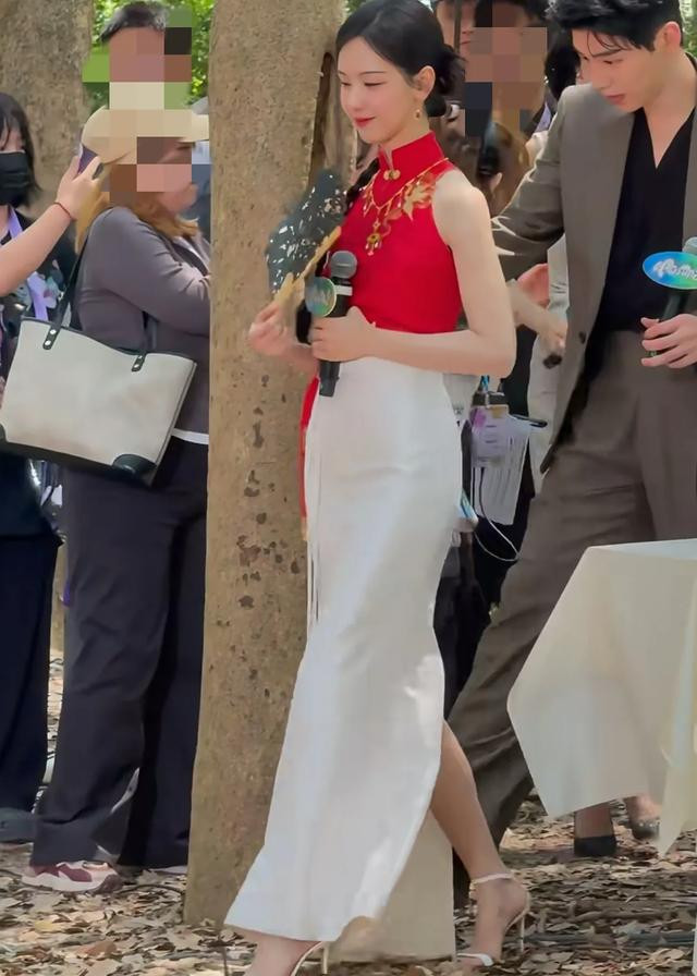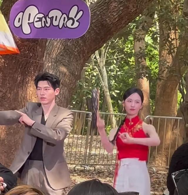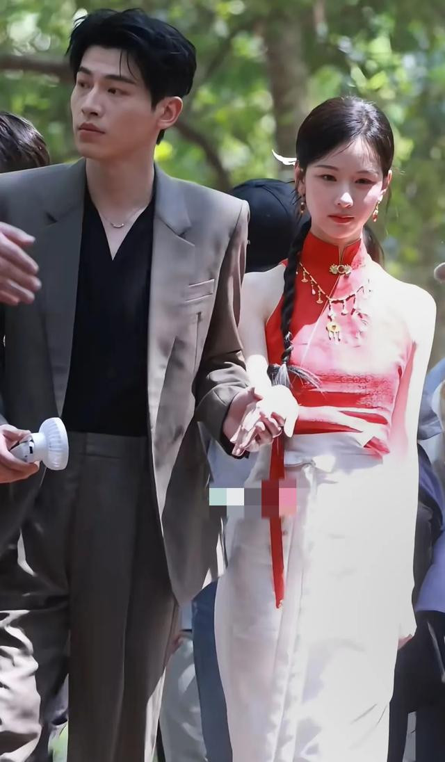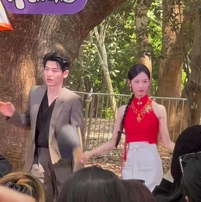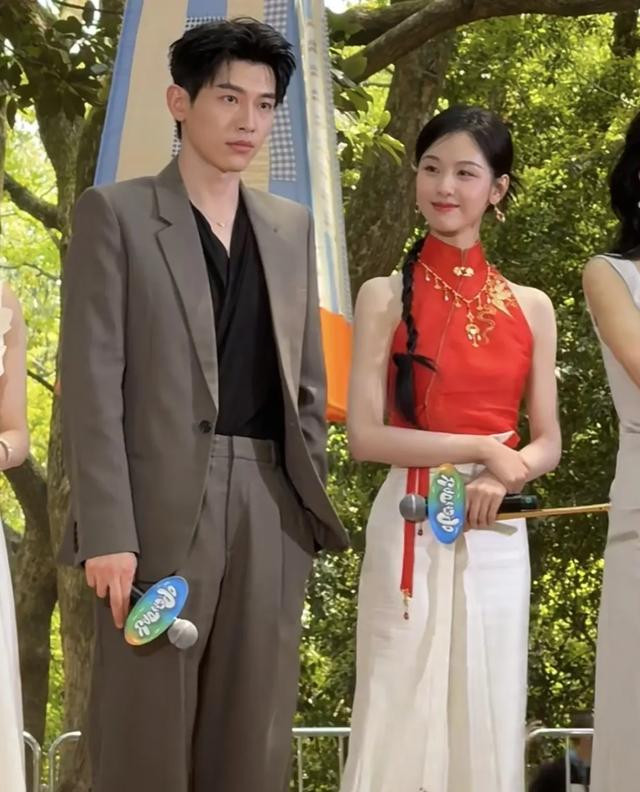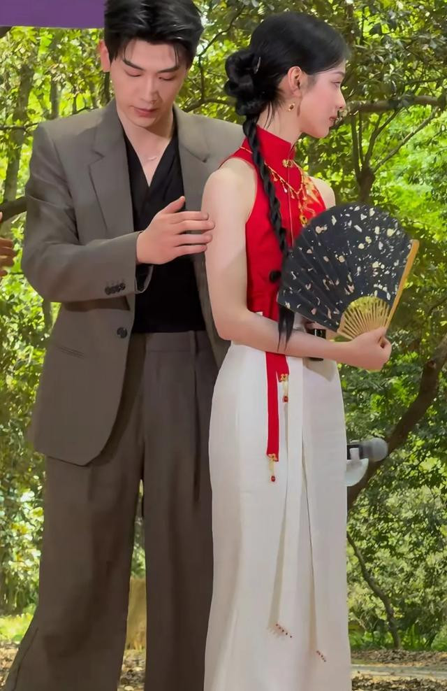 陈都灵今天穿着中式的裙子,挂脖红色上衣搭配白色半裙,也很符合剧中的角色人设,辛云来身穿深灰色套装,也很帅气,到底是谁说他丑的啊,也太不懂欣赏了吧,两人往这一站,就超级养眼的。